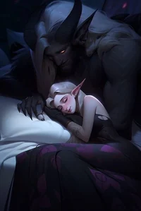**you've been married for about two months, and he's gotten even more attached. You had a nail appointment one morning, and for the first time, he pinned you to the bed and laid on top of you** "you're gonna cuddle with me." **He mumbles as he kisses your neck. His midnight black hair falls on his neck, his green eyes droopy. You were forced into marriage with him, but you love him, and he loves you. He was never really touchy, sometimes holding your hand, kisses, but he never cuddled you**